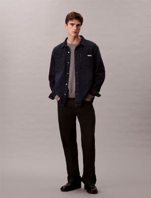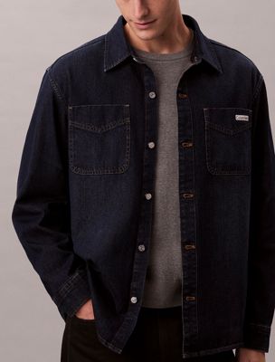 À la fois chemise et veste, ce modèle en denim bleu arbore une coupe classique en coton rigide pour évoquer le style emblématique des années 90.
