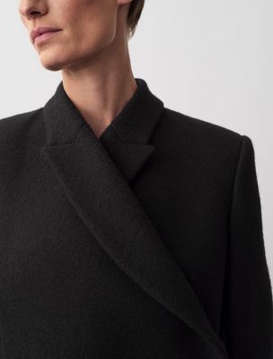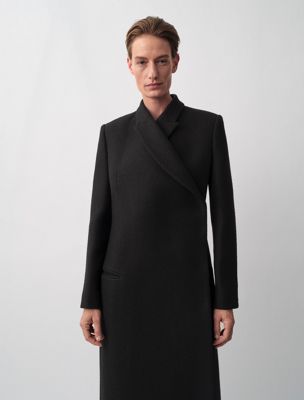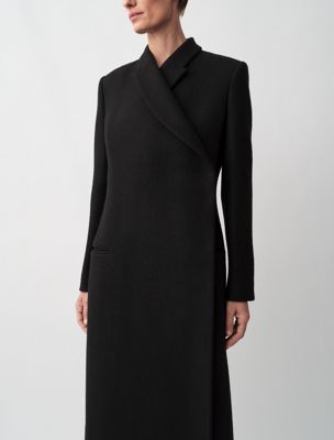 Un manteau longueur cheville à double boutonnage, doté d'une silhouette cintrée et d'une fermeture boutonnée sur le côté. Il est fabriqué dans un mélange de laine bouillie et de soie double-face.