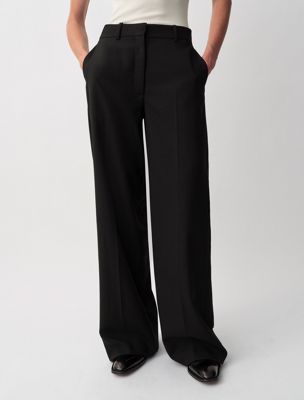 Un pantalon à taille haute et à jambes larges, confectionné en 100 % laine légère. Il présente des plis pressés le long des jambes.