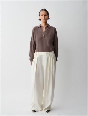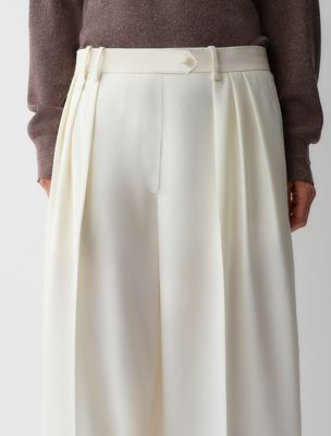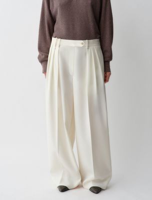 Réalisé en laine, ce pantalon cintré à taille mi-haute arbore des jambes larges, un triple pli sur le devant et des poches latérales obliques.