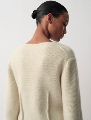 Un pull 100% cachemire, caractérisé par des coutures verticales sur le devant et par une silhouette décontractée à col ras-du-cou.