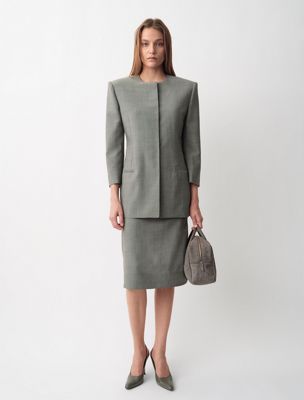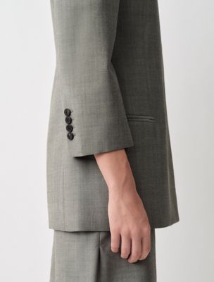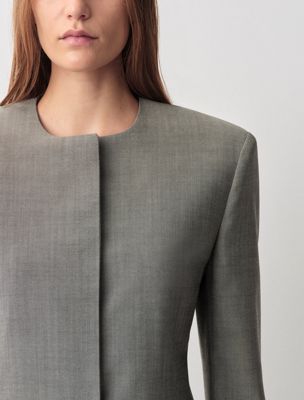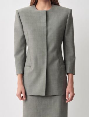 Une veste blazer structurée sans col, entièrement doublée avec des boutons invisibles et des manches raccourcies. Elle est fabriquée en 100 % laine.