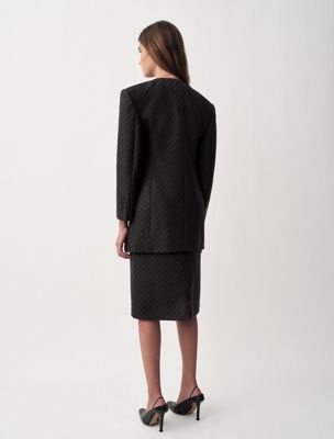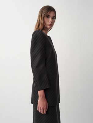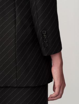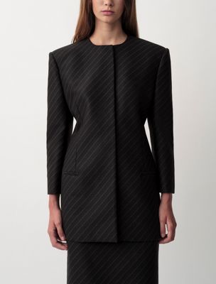 Une veste blazer structurée, sans col, dotée d'une forme en sablier. Une pièce entièrement doublée à simple boutonnage avec des boutons invisibles. Elle est réalisée en jacquard exclusif à rayures diagonales sur un tissu 100 % laine compacte.